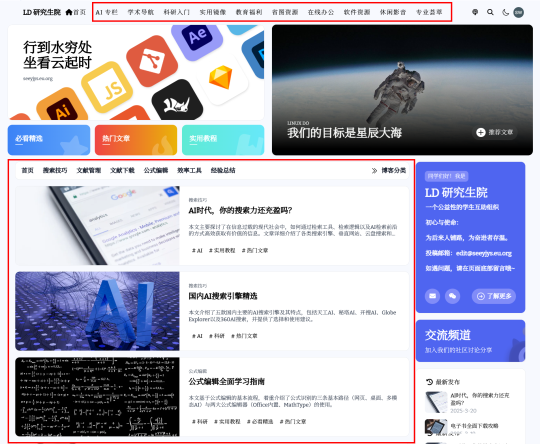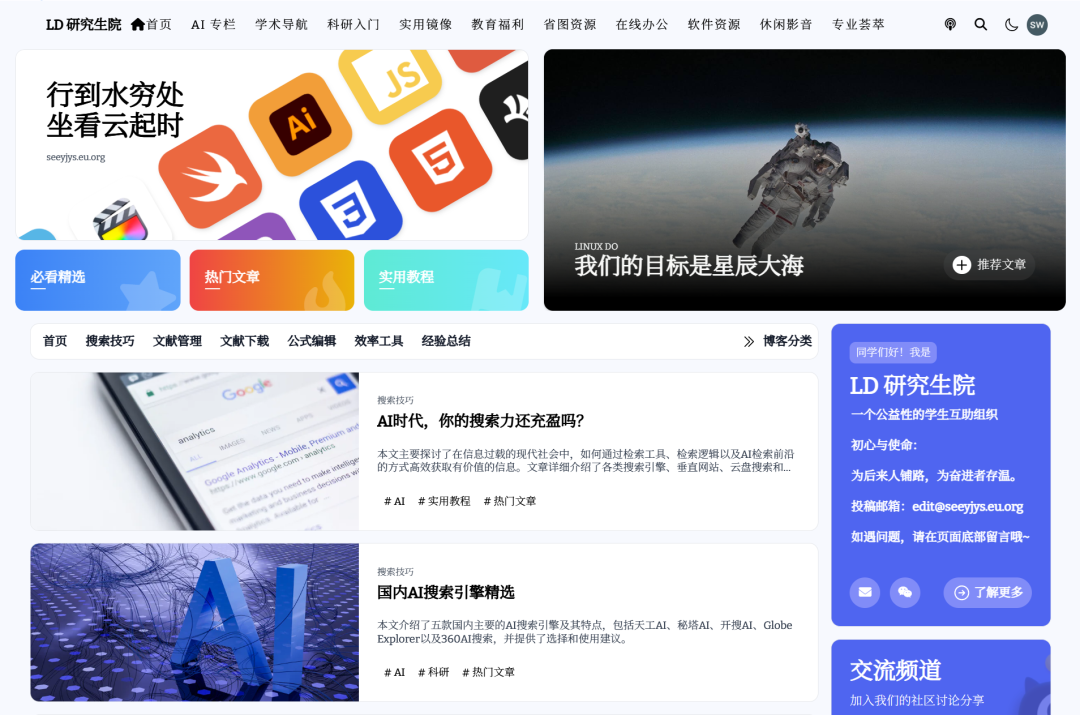 临近毕业,小编在消失的这段日子里,顺带整了个大活:将原有博客站和研修室内容进行整合,同步汲取 LINUX DO论坛 的丰富语料,并借助NotionNext开源框架,成功搭建起一个公益性的研究生互助学习平台 —— LD研究生院 ,希望能够吸收作为新鲜血液的你。