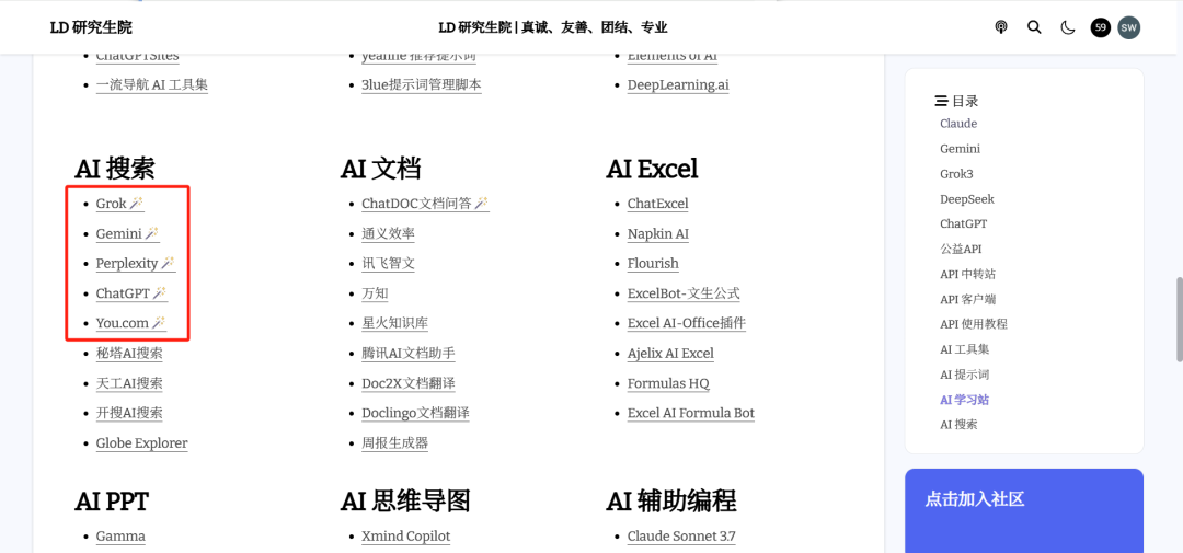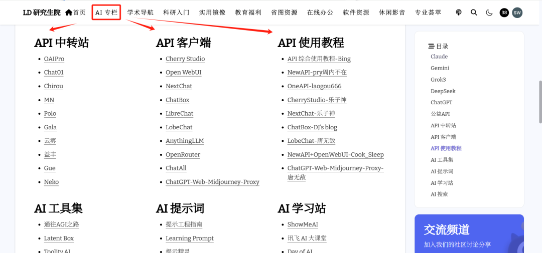 该版块囊括了AI使用过程中的方方面面,包括国内外主流AI的免费镜像、API使用教程、AI学习资源、AI办公资源、AIGC工具等等。