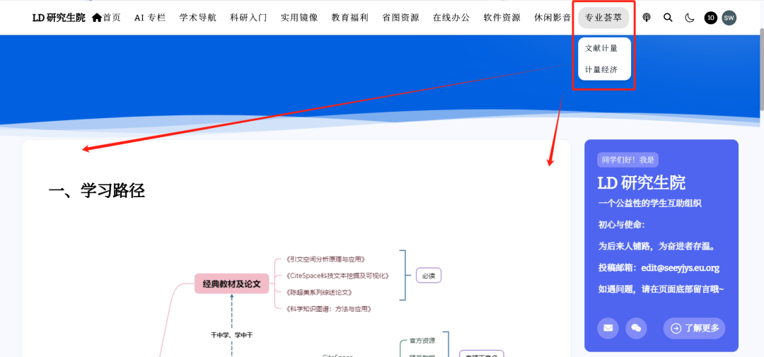 LD研究生院主要有两大重点功能区: ①站点顶部的常态化功能页面; ②站点左下侧的动态博文区。