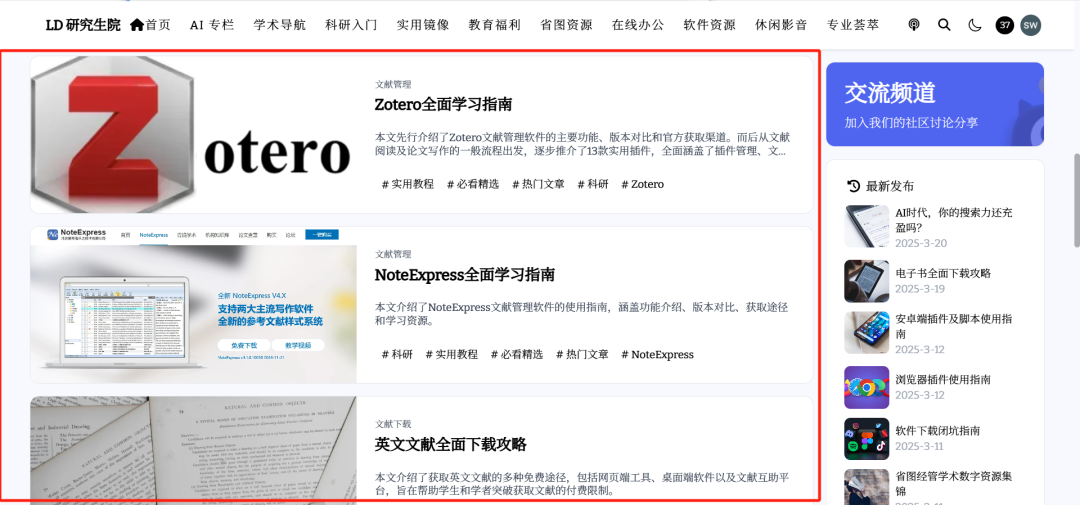 作为网站的又一重点功能区,主要收录科研软件的实用教程、各大工具的实测体验、科研写作的经验总结等一切与科研有关的干货文章。如果说前面的常态化功能页面是“硬件”的话,那么该版块就是“软件”了。