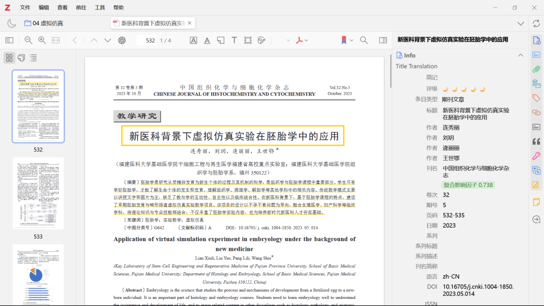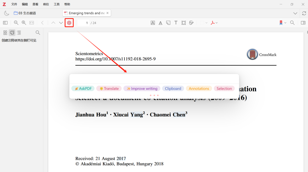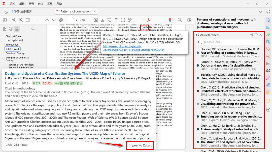 很好地解决了这一需求痛点,它会在PDF文件打开伊始,自动解析参考文献列表,用户点击右侧边栏的引号即可看到。另外,将鼠标放置在文中特定引用处不动,该参考文献便会自动浮现,单击该条目后,插件会进一步显示该参考文献的期刊等级、摘要、引用次数等,并且支持一键导入Zotero本地文库,便于后续引用。