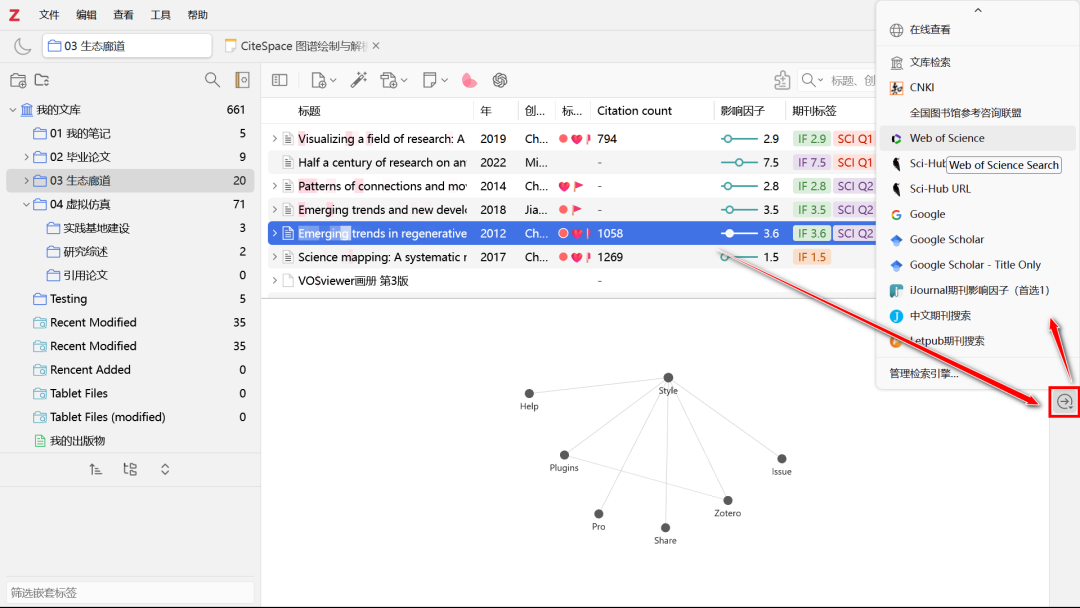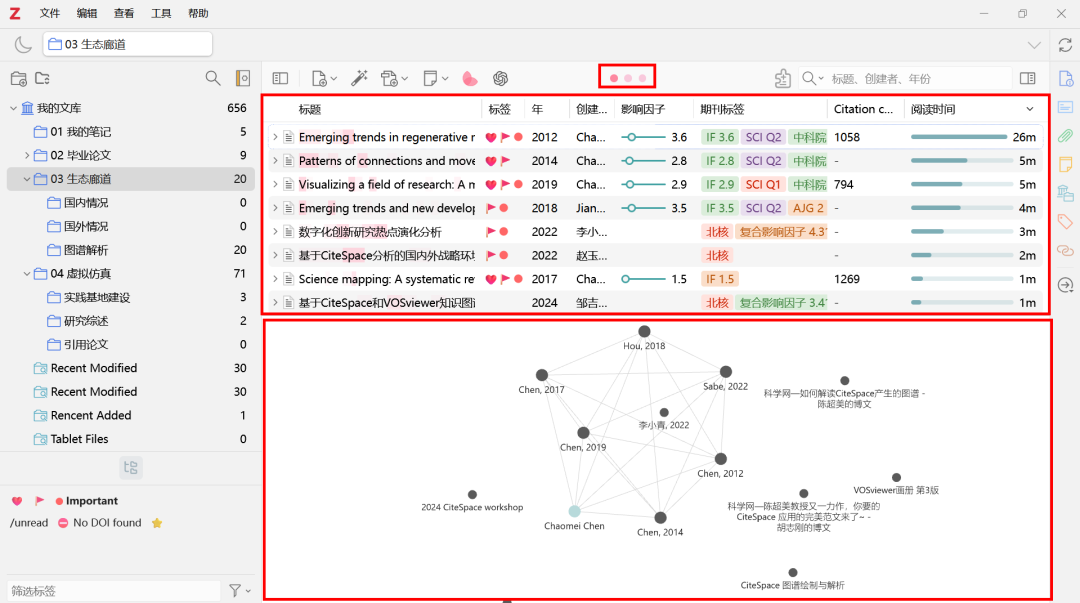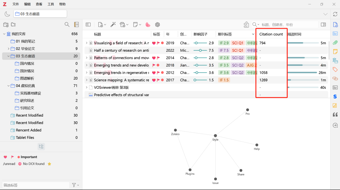 进行题录规范化后,便可以放心开展文献筛选工作了。Ethereal Style 的主要功能是:将文献的影响因子、期刊等级、阅读时间、相关关系等衡量指标以可视化形式呈现出来,供用户快速取阅,从而提高筛选效率。