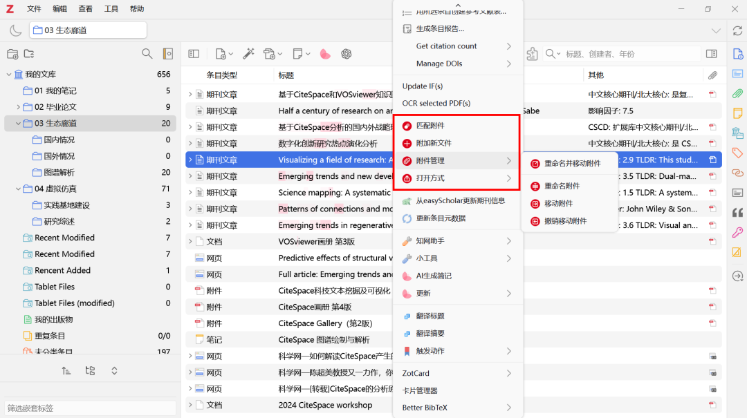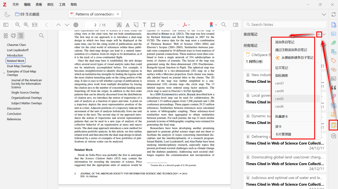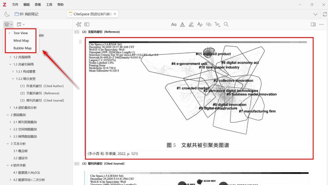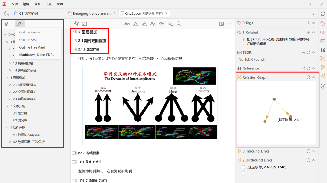搭配插件,Zotero 可以将具体的文献内容快速嵌入到笔记的指定位置,从而通过目录树、思维导图、气泡关系图等呈现形式,帮助我们高效进行文献梳理。