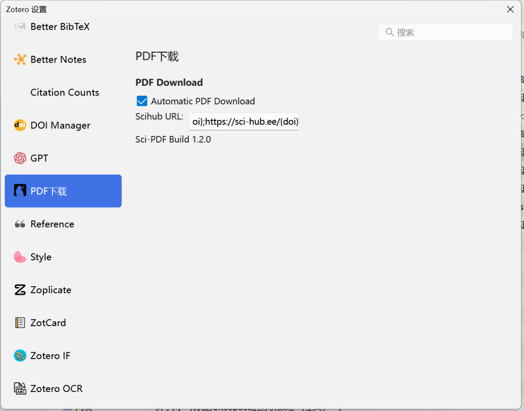 与茉莉花插件相对应,Sci-PDF能够依据题录信息自动从SCI-Hub当中下载英文文献,其(镜像)网址设置如下: