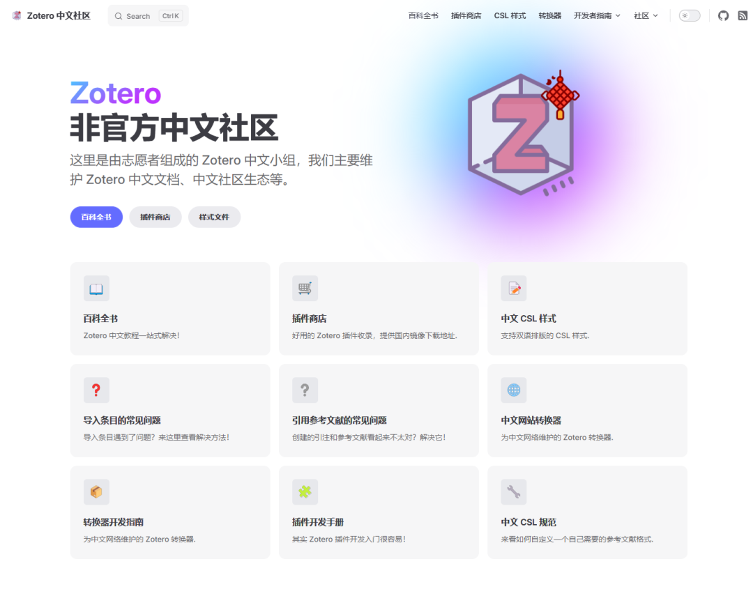 Zotero真正的强大之处,不仅在于软件本身的优异表现,更在于其开源社区提供的强大插件支持。在这里要特别鸣谢Zotero非官方中文社区为国区用户所作出的突出贡献,他们将Zotero使用过程中的基本常识、实用插件、样式规范等进行了全方位汇总,免费提供给有需要的人群进行学习取用。毫不夸张地讲,该网站是每一位初学者必须知道的宝藏网站,其访问地址为:https://zotero-chinese.com/