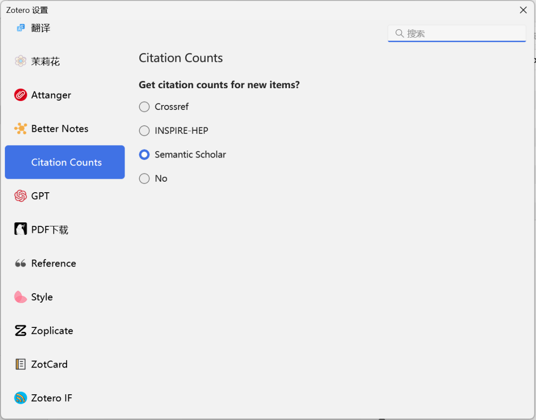 引用次数也是我们筛选文献时的重要指标,该插件支持从 Semantic Scholar、Crossref、INSPIRE-HEP获取文献的引用次数,设置后可作为文献筛选的参考指标进行列示。