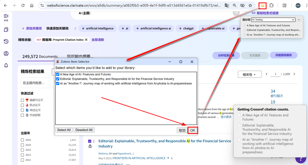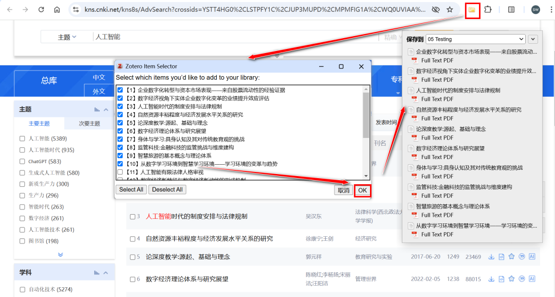 这里要特别说明一下连接器插件的用途:Zotero Connector 是一个浏览器插件,主要负责将引文数据库的题录信息直接传入桌面端Zotero,且搭配相应插件(茉莉花+Sci-PDF)可以自动、批量且快速地完成文献PDF的下载、命名与匹配。