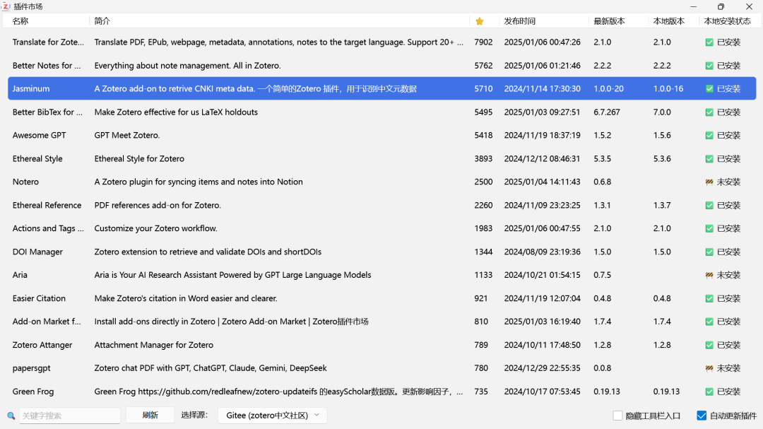 顾名思义,该插件的主要功能同手机APP的应用市场类似,主要为用户提供 Zotero第三方插件的一站式下载、安装与更新服务。它相较于单一插件的本地安装方式(下载-导入-安装),具有显著的效率优势,能够避免用户来回折腾,同时提供多个国内下载源,实为插件界的“百宝箱”。下文所提及的全部插件均可在此插件内便捷下载、安装与更新,故将之列为个人必装插件之首。