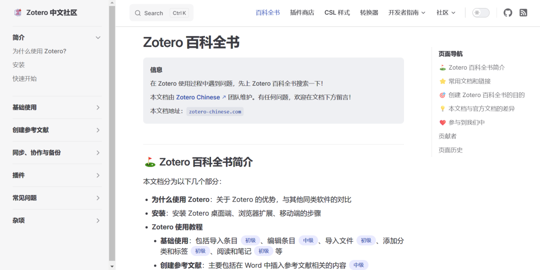 Zotero百科全书由非官方中文社区撰写并维护,内容涵盖Zotero使用的方方面面,非常适合初学者进行查阅,访问地址:https://zotero-chinese.com/user-guide/