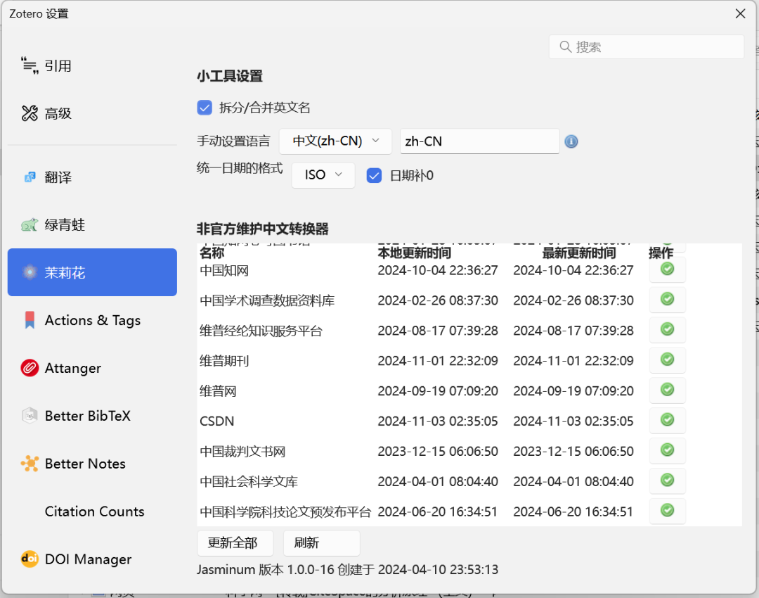 通过初步筛选的论文,我们总是希望能够将之下载下来,以备后续精读。茉莉花(Jasminum)插件便是实现这一目的有力工具,它支持从中国知网、维普、百度学术等中文数据库全文下载中文文献(前提:用户具备相应的下载权限),同步支持知网元数据的抓取工作。