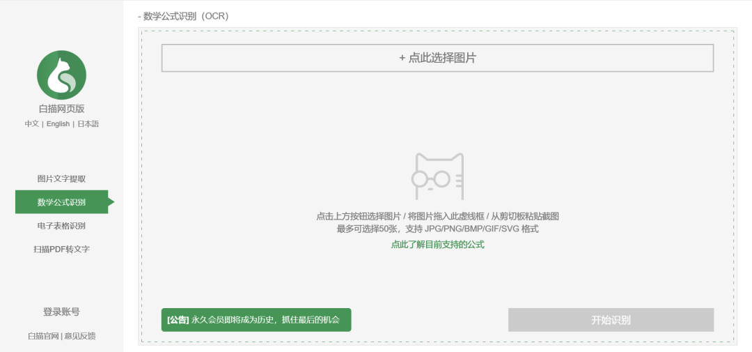白描网页版支持数学公式的免费、免注册识别,最多支持50张图片同步识别,但精度有限 ,只能用于识别一些形式简单的公式。
