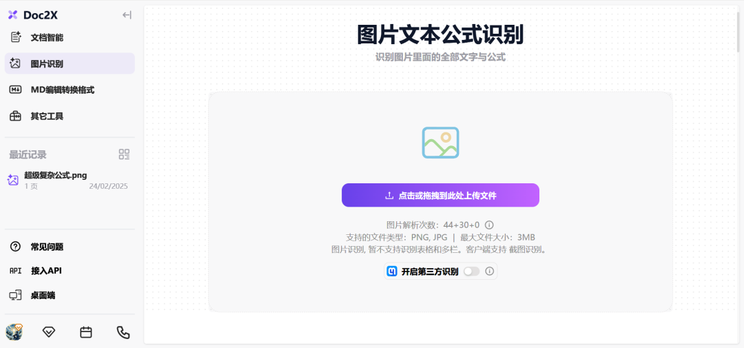 Doc2X作为业界新秀,博采众长,支持通过AI翻译与解析文档、识别图片文字及公式、转换MD文件格式等,具有高精准识别度,但需注册后方可使用。