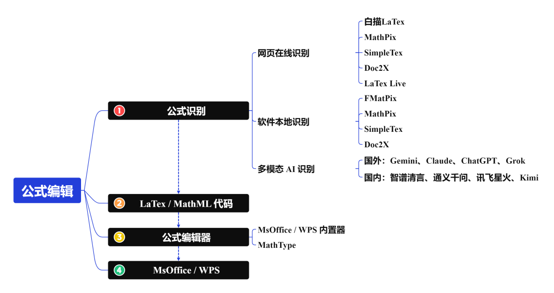 目前公式识别的途径已相对丰富,按使用形式的差异大致可分为三类,即:网页在线识别、软件本地识别及多模态AI识别。