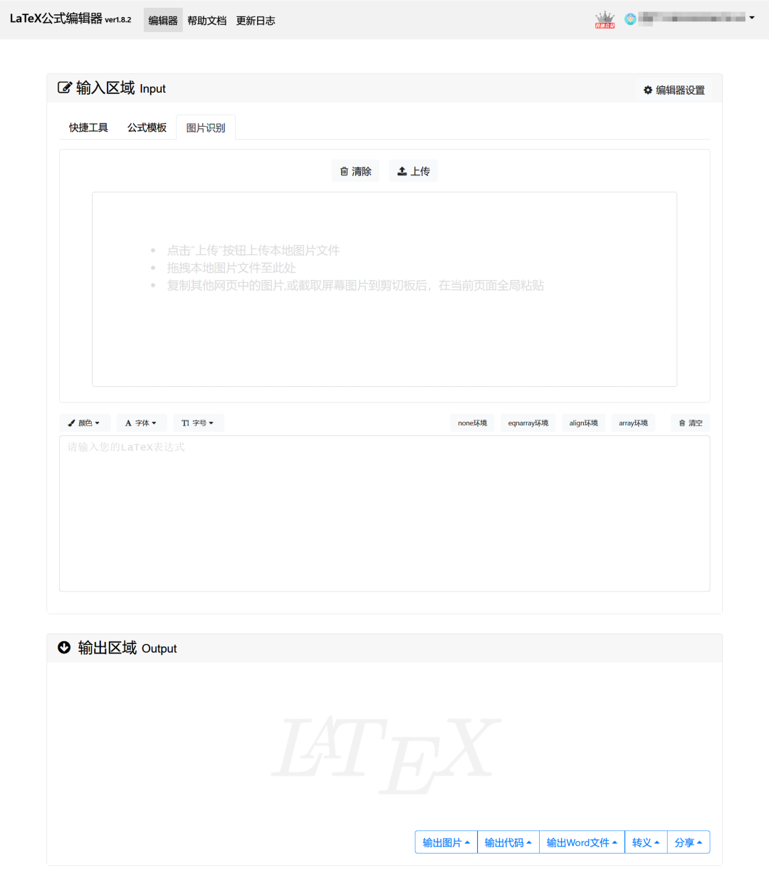 LaTex Live是一款相对老牌的在线公式编辑器,它 识别精度高,支持公式识别、代码预览、多格式输出 ,使用体验良好。令人遗憾的是,该网站需注册使用,免费额度为2次/天 。