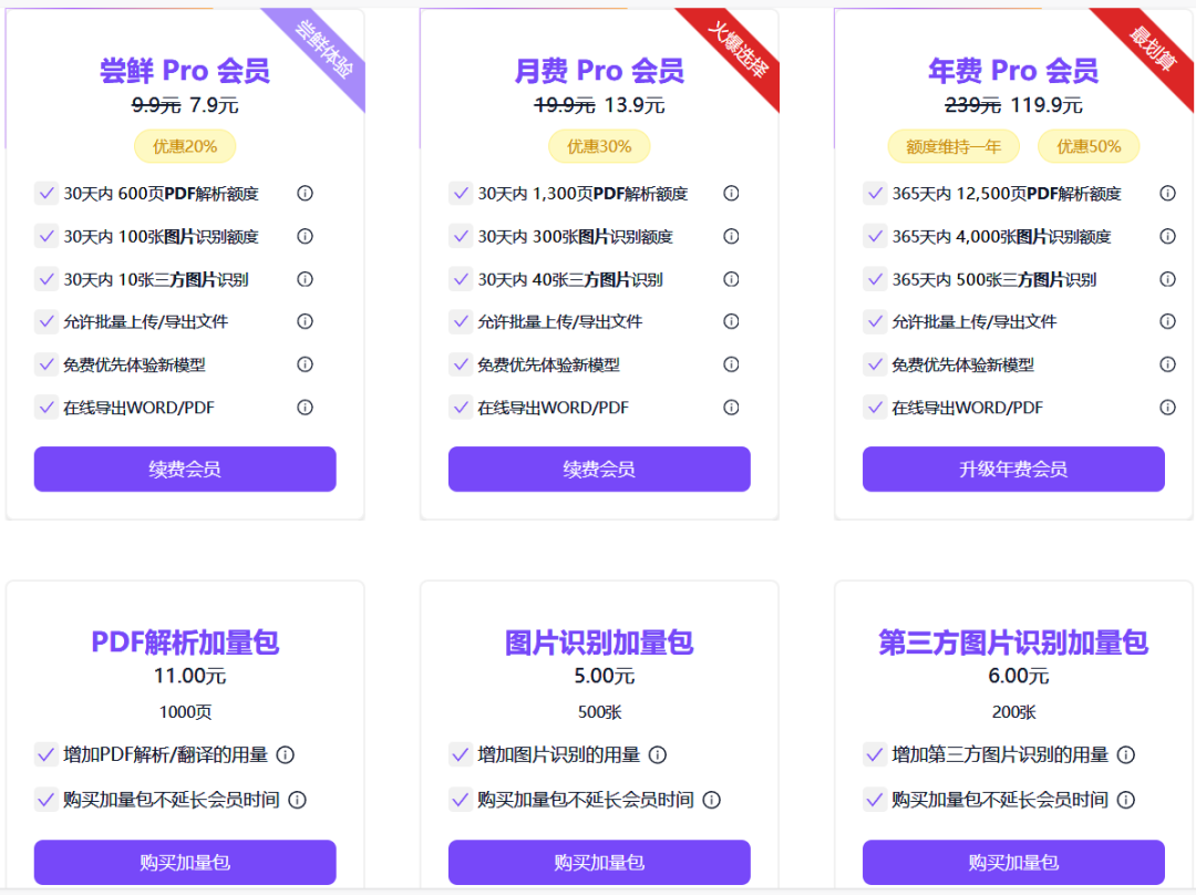 当日额度用尽后,需按次数或时段付费购买相应额度,具体详情如下: