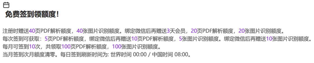 值得一提的是,Doc2X 目前注册送额度,绑定微信后加送会员,还允许用户每日签到累积额度,如果需求量不是很大的话,日常用也够了。具体详情如下: