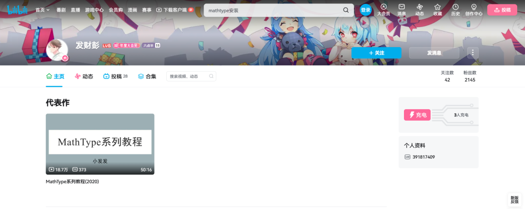 上述部分只是MathType最基本的用法,有更深需求的读者朋友们可以去看看B站UP主(发财彭)推出的系统教程,讲解很细致。 地址:https://space.bilibili.com/391817409