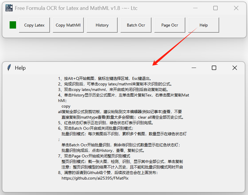 首先推荐一款开源、免费且实用的公式识别程序——FMatPix,其识别精度较高,支持截图OCR、批量OCR、公式历史记录、LaTex及MathML代码导出等核心功能。