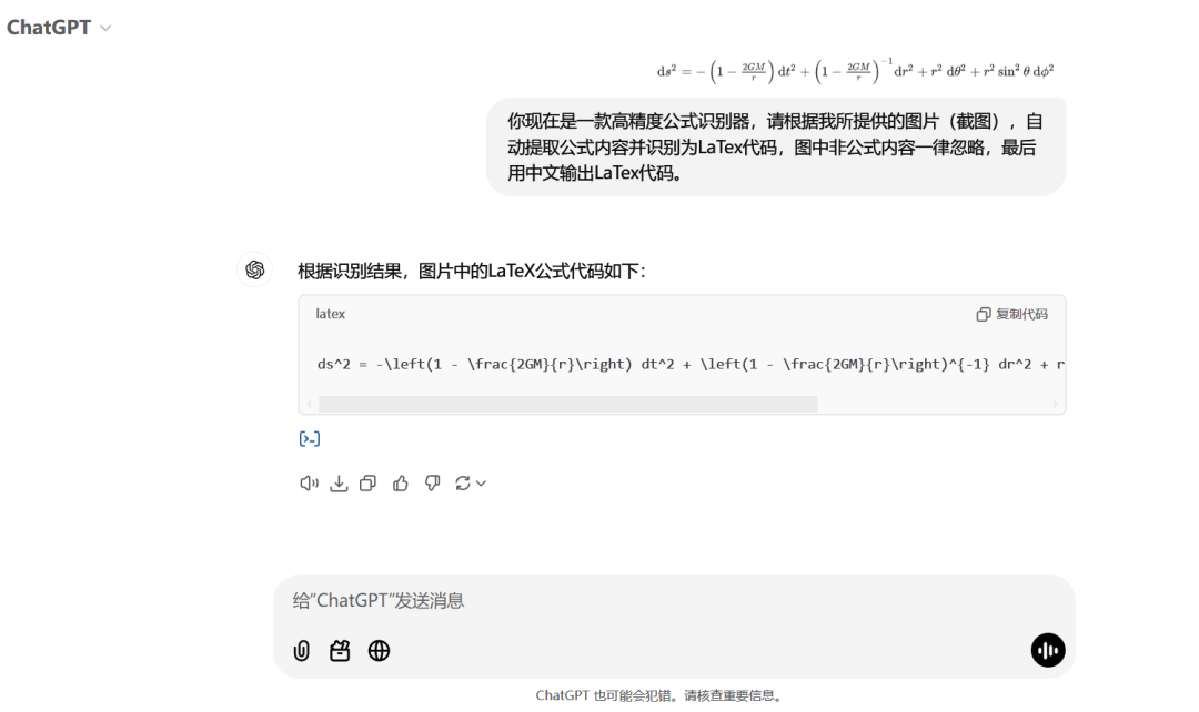 近年来,越来越多AI支持多模态,使得公式识别不再局限于传统OCR形式,以人类自然语言指示AI完成识别任务已成为现实。操作步骤很简单,即:选定一款多模态AI产品,设定提示词并上传公式图片,即可得到公式代码。至于多模态AI产品,国外有Gemini、Claude、ChatGPT、Grok等,国内有智谱清言、通义千问、讯飞星火、Kimi等,普通人免费额度足够应付日常所需了。