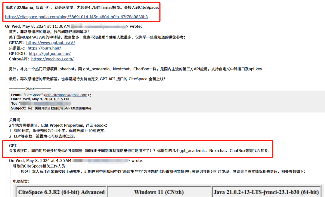 如果你有任何软件使用上的难题,搜索无果后都可以通过该邮箱向陈超美教授团体去信,响应相当及时。幸运的话,你甚至能和陈超美教授来一场跨越大西洋的在线交流。不要觉得我是在虾扯蛋,我曾因CiteSpace中的GPT标签聚类问题向其请教,均得到耐心解答,甚至还推动着Ollama接入了CiteSpace!!!