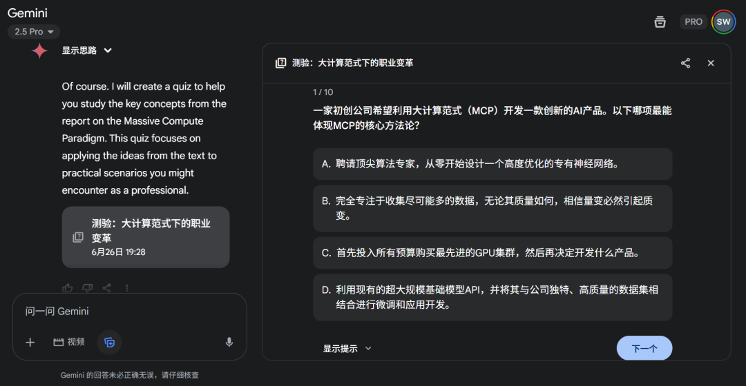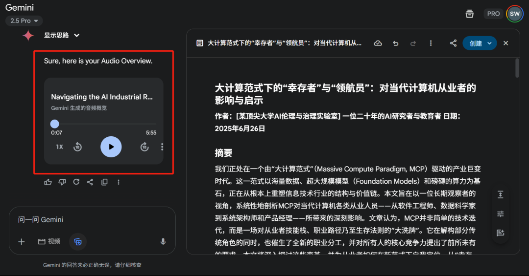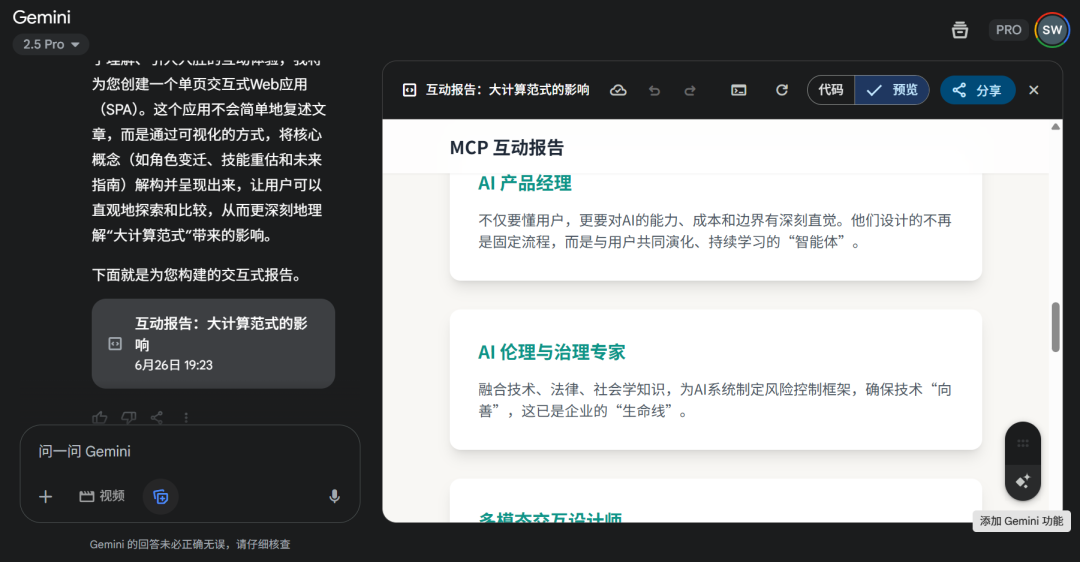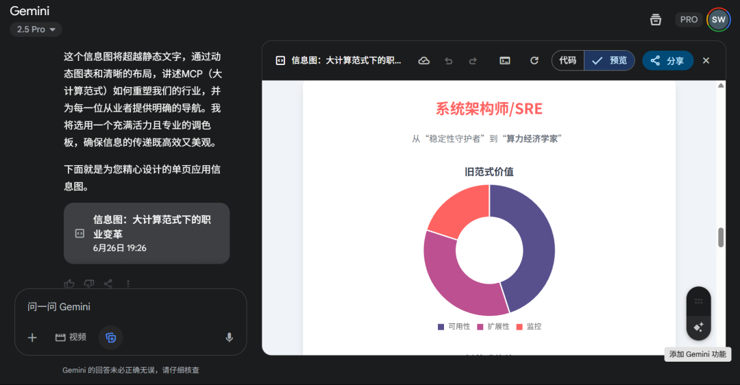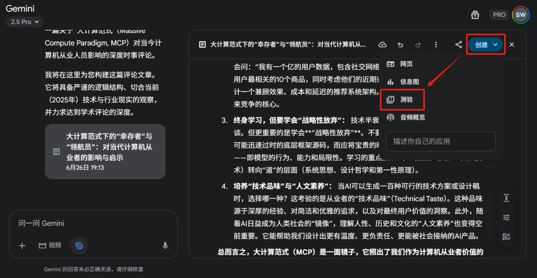 这是Gemini最惊艳的地方!它可以一键将你的文章终稿,转化为交互式网页、信息图、小测验,甚至是音频概览。这对于知识分享、教学演示等场景来说,简直是降维打击。