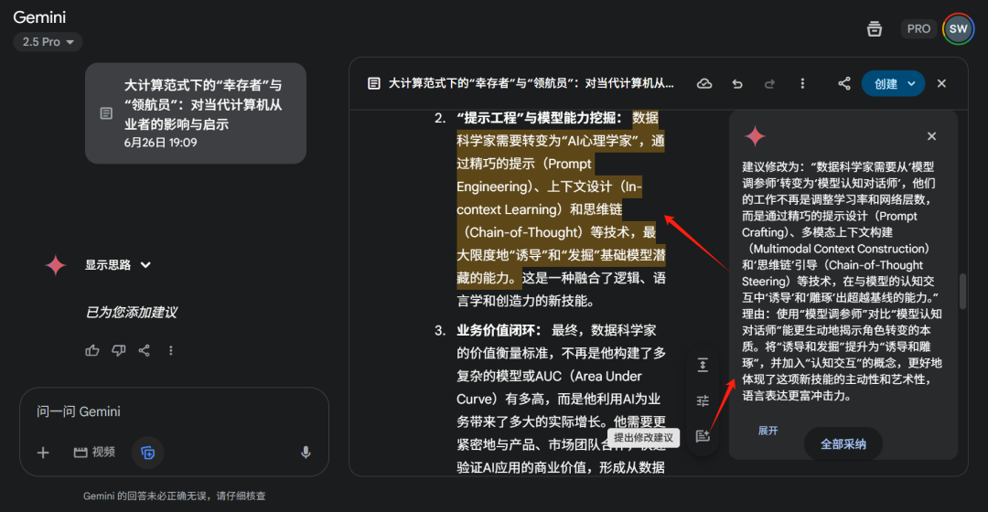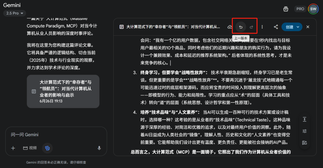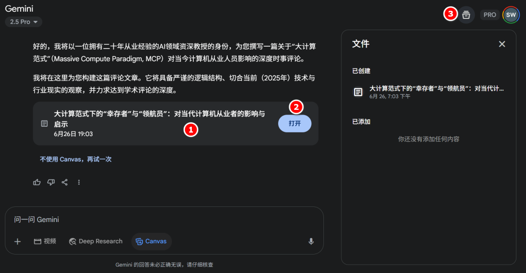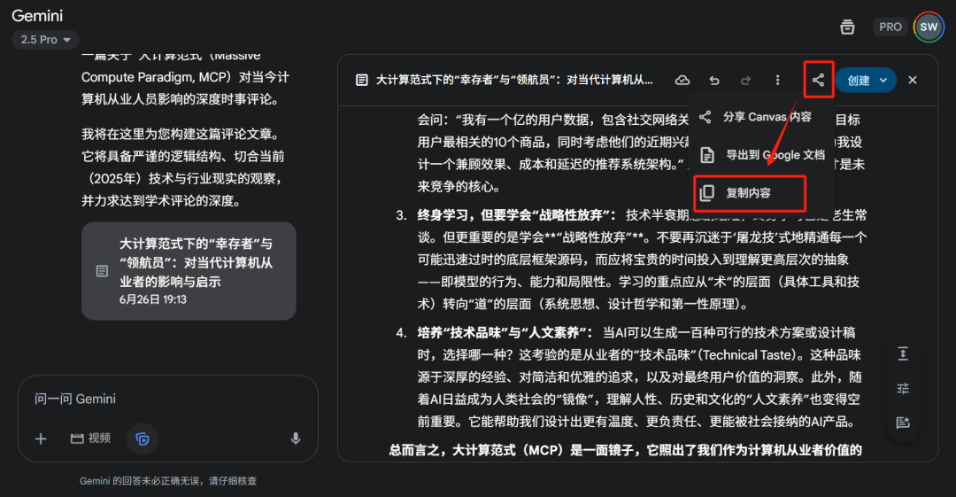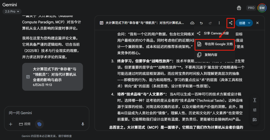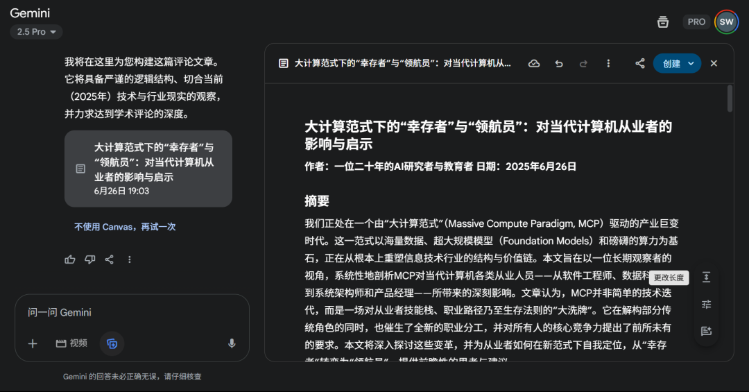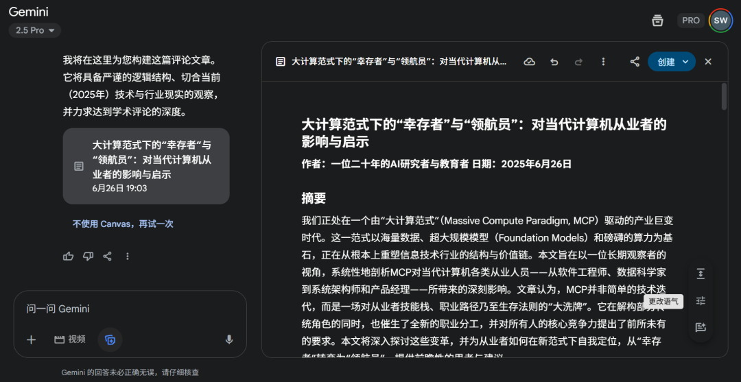 (1)构思与初稿:使用 Gemini 的Canvas进行头脑风暴,生成大纲和初稿。它的中文理解能力和创意发散能力非常出色。