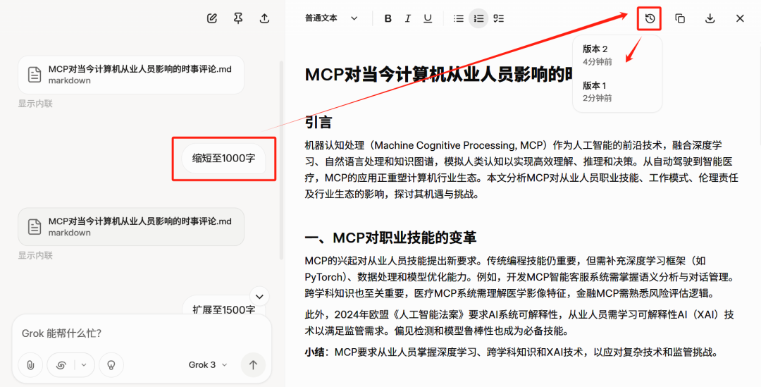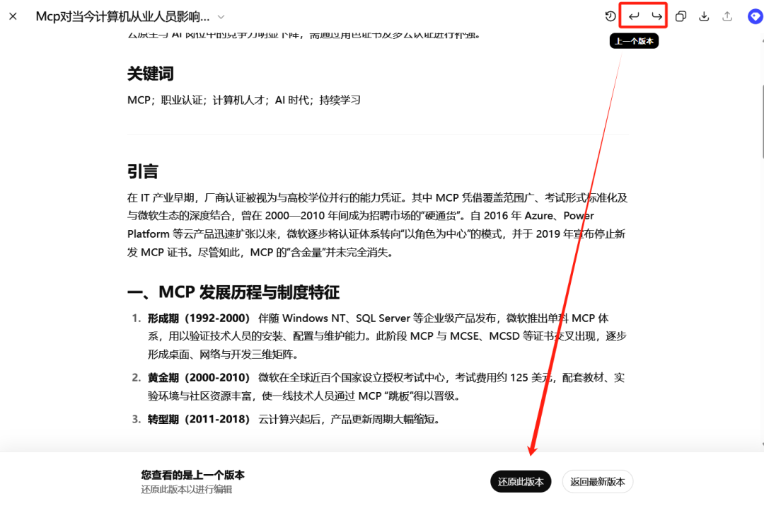 目前仅支持在聊天输入框内通过指令修改后切换历史版本。