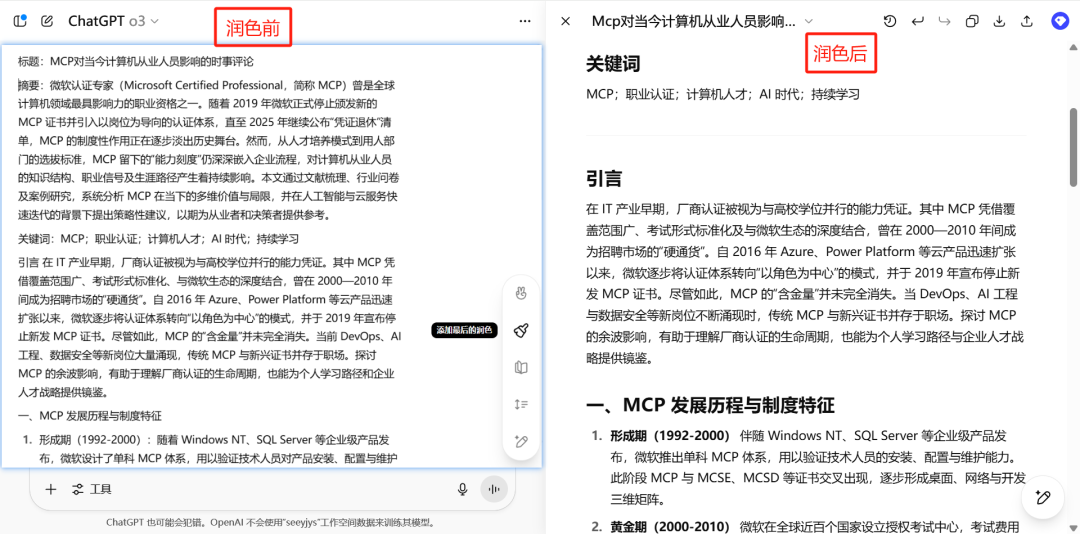 (2)精修与打磨:将Gemini生成的初稿,复制到 ChatGPT的Canvas中。利用其丰富的编辑功能(如调整阅读水平、建议编辑、最后润色等)进行深度打磨和二次创作。