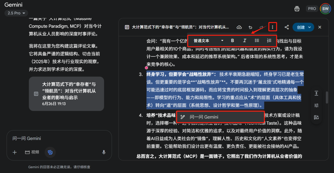 主要包括:询问Gemini、更改文字样式、人为修改文字