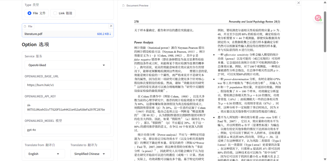 配置要点:如果你的API为镜像中转API,服务商需选xxx-liked,要保留原文档格式需将BabelDoc选项给选上,示例配置如下 :