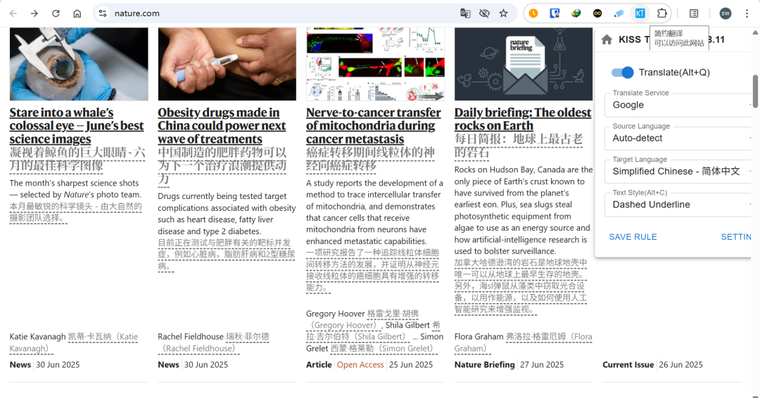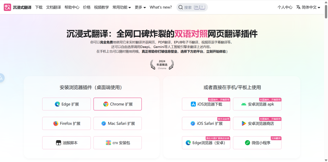 推荐理由:大名鼎鼎的翻译界“六边形战士”。它能智能识别网页正文,以“双语对照”的方式呈现,且保留原文格式,阅读体验极佳。无论是Chrome、Edge还是Firefox,它都能无缝接入,是你探索外网世界的一大神器。