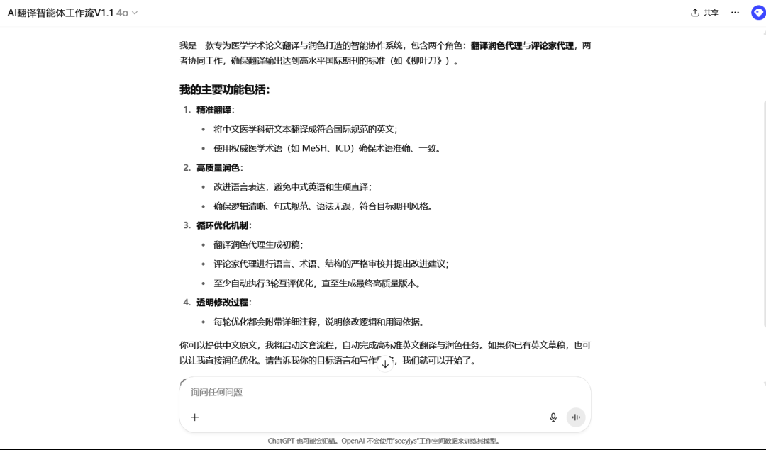 推荐理由:这道菜是“国宴”级别的存在。它不是一个简单的工具,而是在ChatGPT内部构建的一个高级工作流。你可以让它扮演“语言学家”、“行业专家”等多种角色,对同一段文本进行“ 翻译 - 润色 - 校对”的多轮打磨,最终出品堪比专业人工翻译的译文,特别适合科研工作人员!
