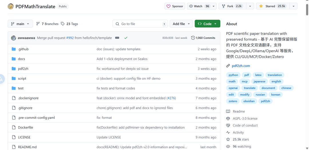 项目地址页:https://github.com/Byaidu/PDFMathTranslate