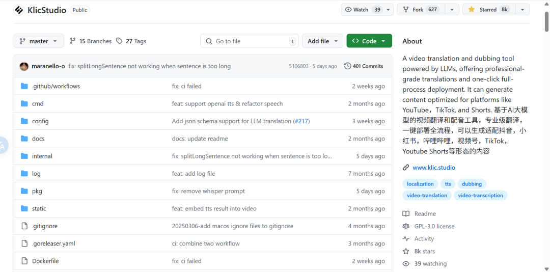 推荐理由:程序开源,功能强大。它不仅能翻译视频,还能利用AI进行 字幕翻译、 声音克隆和配音 合成