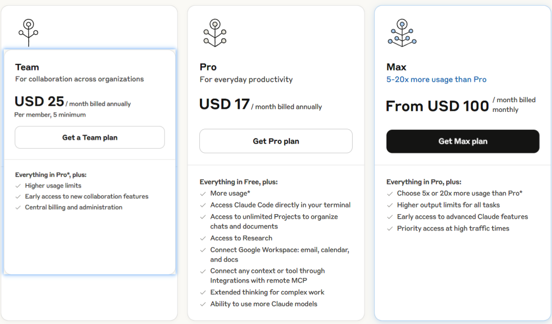 付费套餐:$17/月(Pro)、$25/月(Team)、$100/月(Max)。