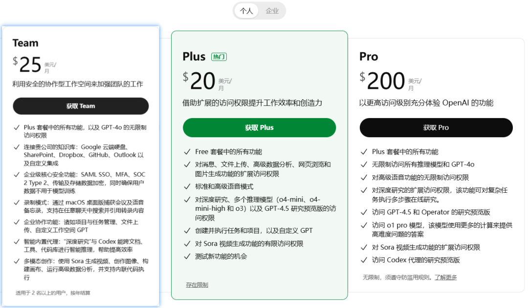 付费套餐:$20/月(Plus)、 $25/月(Team)、 $200/月(Pro)。