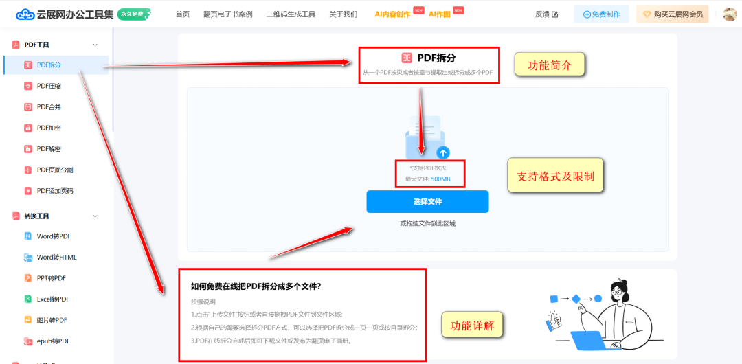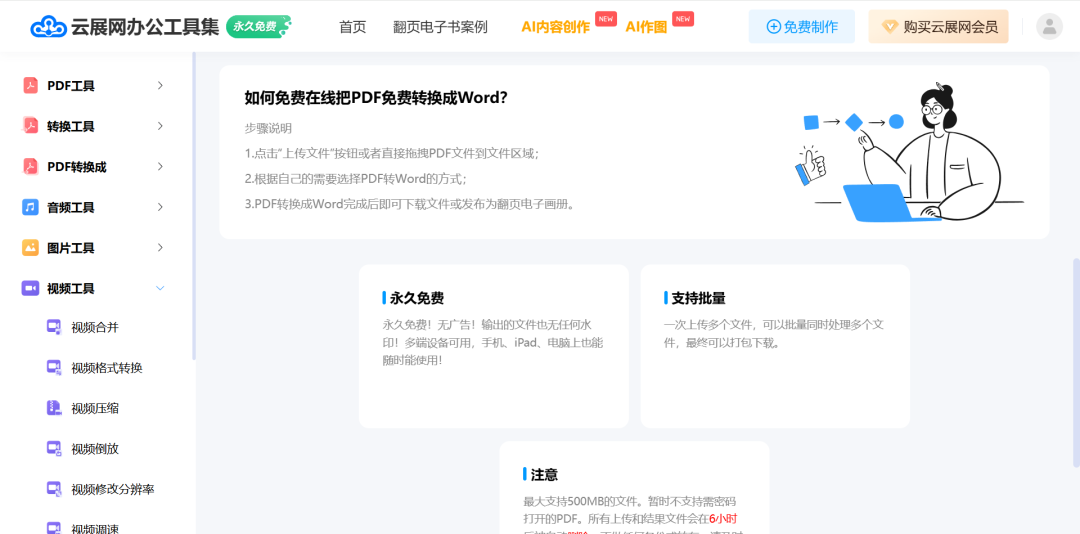 由云展网出品的轻量级办公工具集网站, 登录后可永久免费使用,最大文件限制为500MB,内容包括打工人最常用的PDF工具、转换工具、音频工具、图片工具、视频工具。