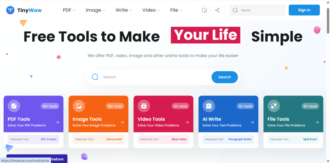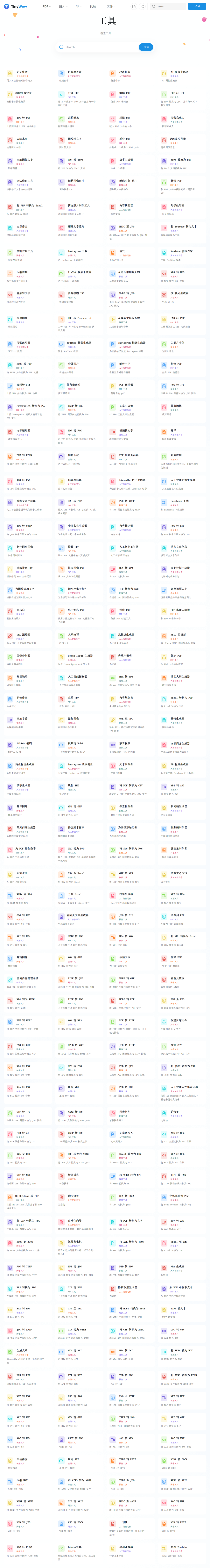 如果你觉得前面两款产品无法满足你的需求,那么不妨来看看TinyWow。它包括我们常用的PDF工具、图像工具、视频工具、AI写作工具、文档处理工具,同样功能众多,无需登录,使用免费。