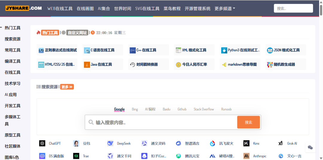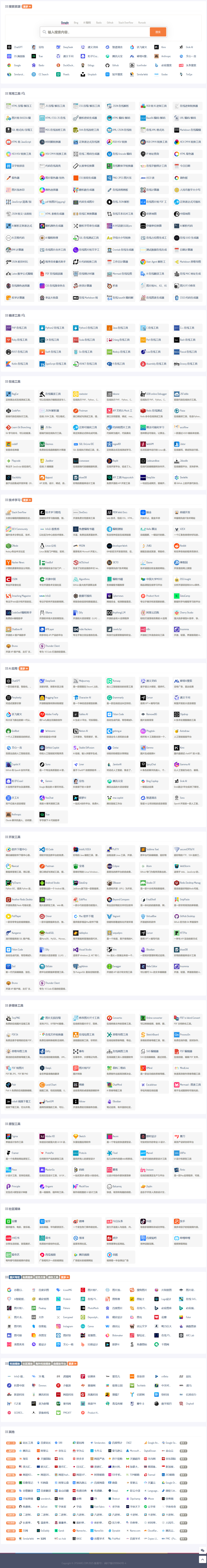 内容涵盖搜索资源、常用工具、编译工具、在线工具、技术学习、AI应用、开发工具、多媒体工具、原型工具、社区媒体、图库&色彩、科技媒体。
