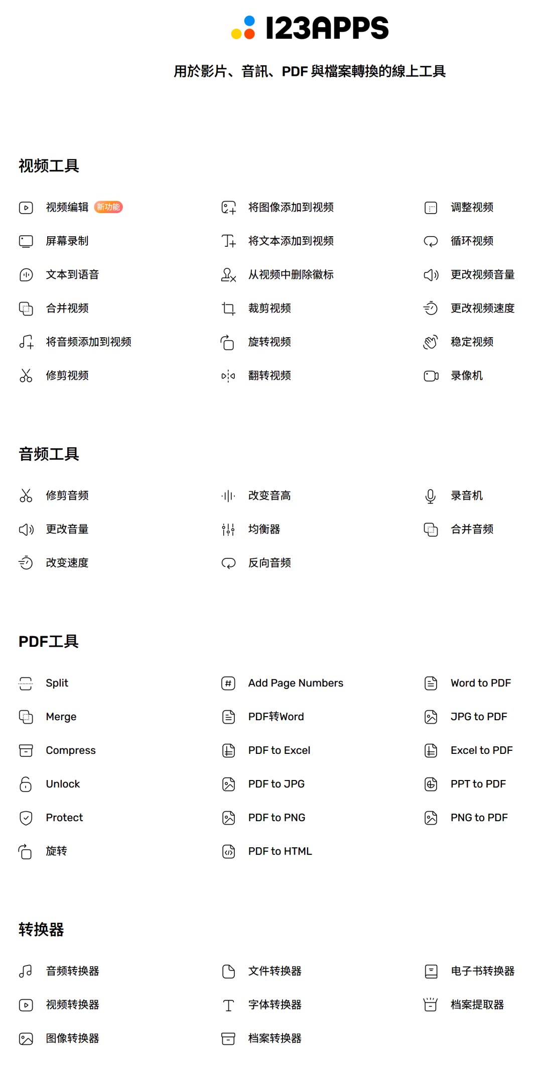 同云展网办公工具集一样,123Apps也是一款轻量级的在线办公工具集, 无需登录,使用免费。内容包括最常见的视频工具、音频工具、PDF工具和转换器工具。