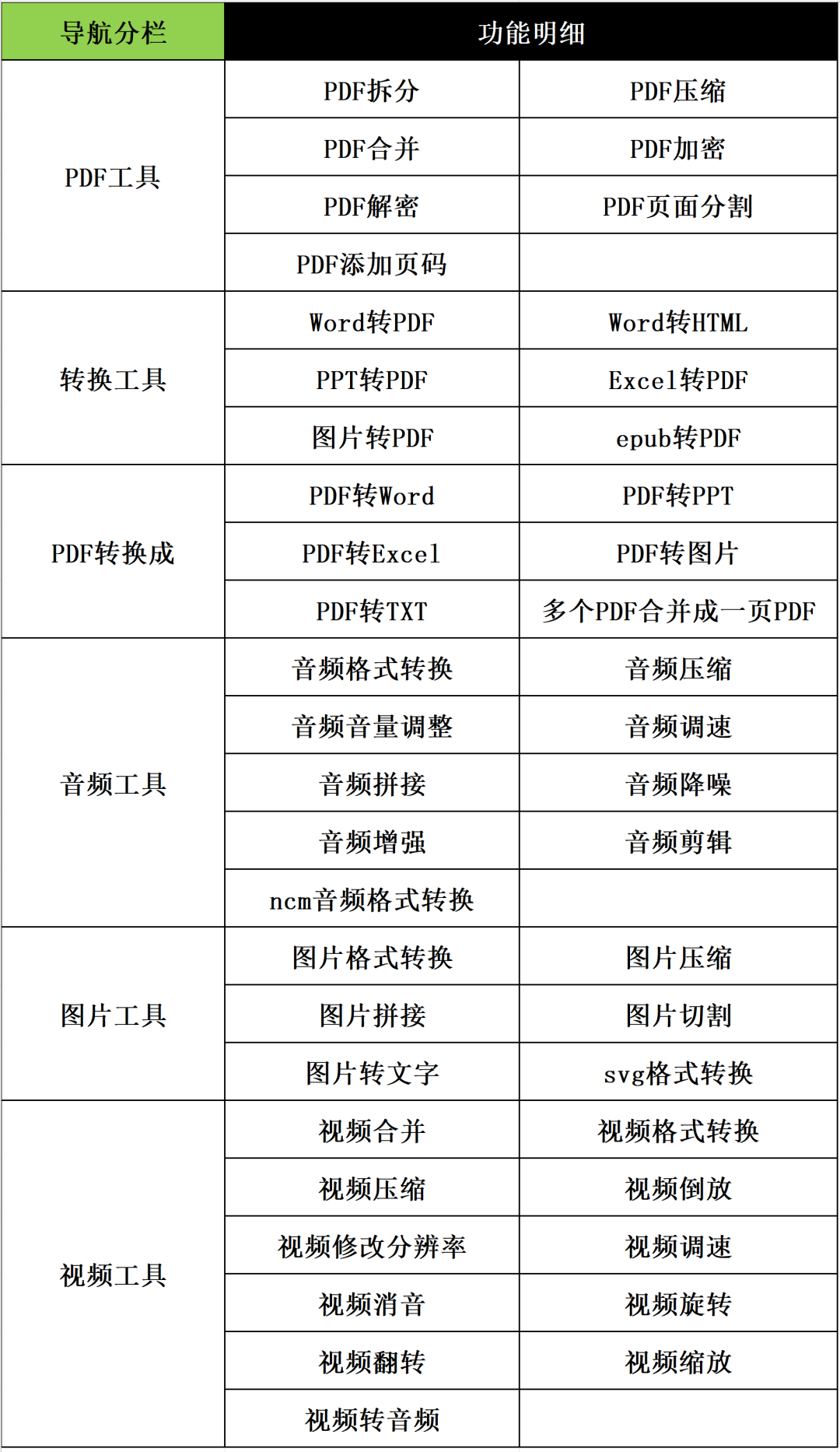 为了方面查看,我做了个功能明细表: