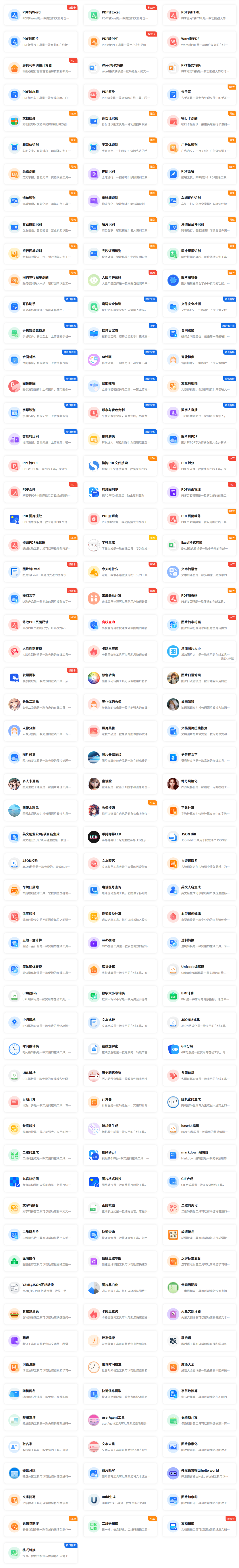 腾讯出品的在线工具箱,质量有保障,内容包括图片工具、PDF转换工具、数据换算工具、生活娱乐工具、教育工具、文本工具、文档转换工具、开发工具、视频工具。目前大部分无需登录即可免费使用。