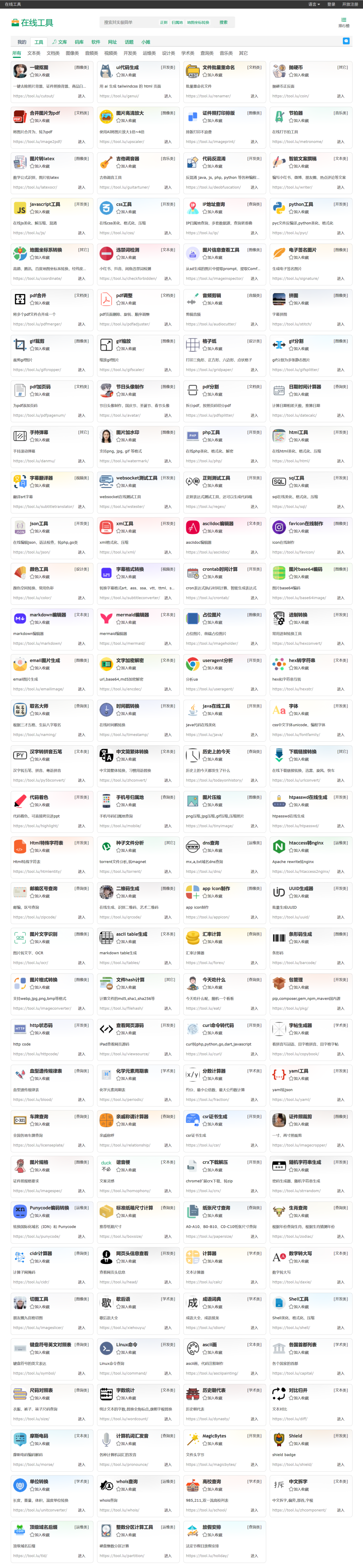 没错,站点名称就叫“在线工具”,就是这么简单直接!内容涵盖文本类、文档类、图像类、音频类、视频类、开发类、运维类、设计类、学术类、查询类、音乐类等众多工具。同样的,无需登录,使用免费。