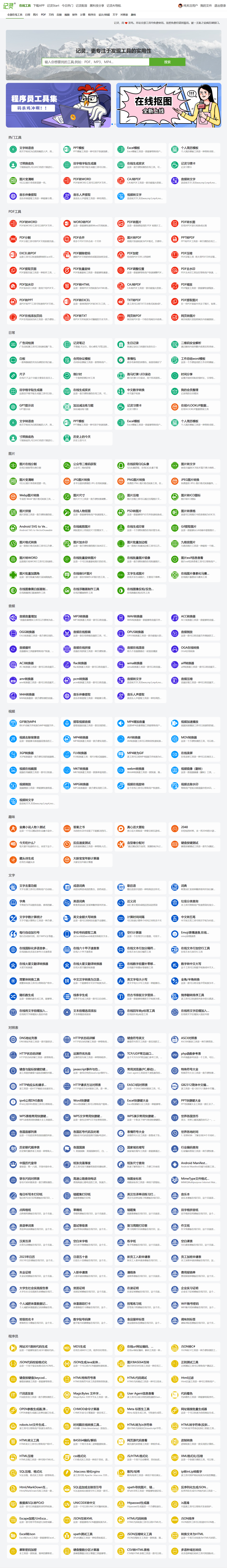 又一款登录后免费使用的工具集网站,内容涵盖:PDF工具、日常办公工具、图片工具、音频工具、视频工具、文字工具、趣味工具、对照表、程序员工具。