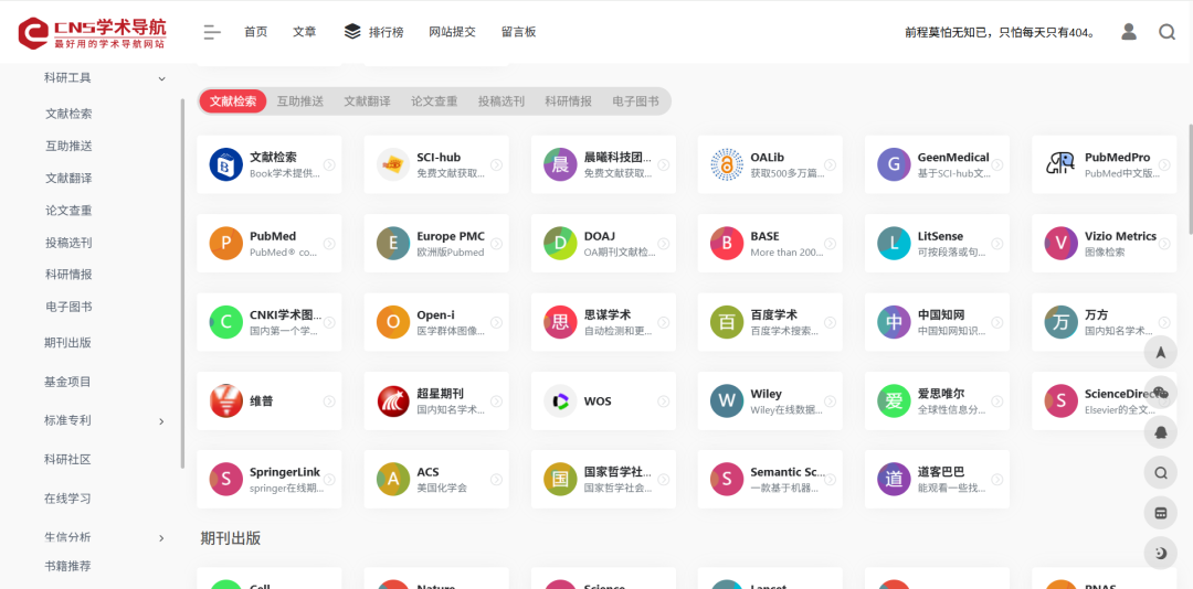 内容涵盖:科研工具、文献检索、互助推送、文献翻译、论文查重、投稿选刊、科研情报、电子图书、期刊出版、基金项目、标准专利、科研社区、在线学习、生信分析、书籍推荐。