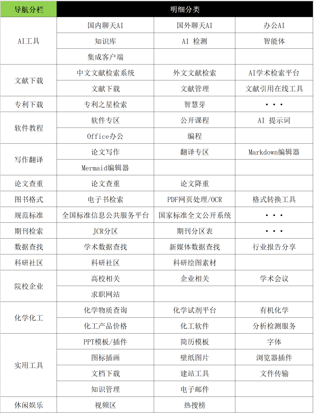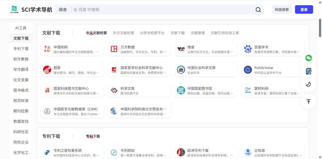 内容涵盖:AI工具、文献下载、专利下载、软件教程、写作翻译、论文查重、图书格式、规范标准、期刊检索、数据查找、科研社区、院校企业、化学化工、实用工具、休闲娱乐。