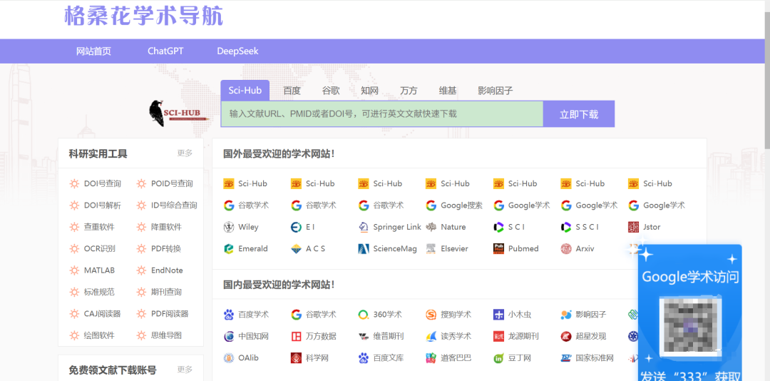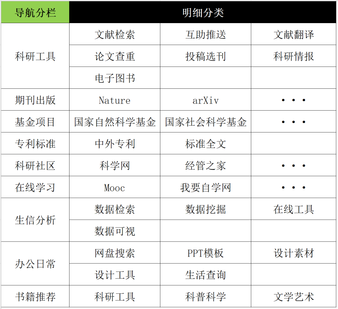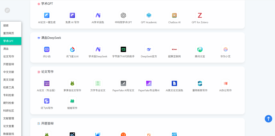 内容涵盖:学术GPT、满血DeepSeek、论文写作、开题答辩、中文文献、英文文献、检索工具、专利检索、期刊检索、科研社区、文献管理、论文查重、数据查找、院校相关、摸鱼神器。