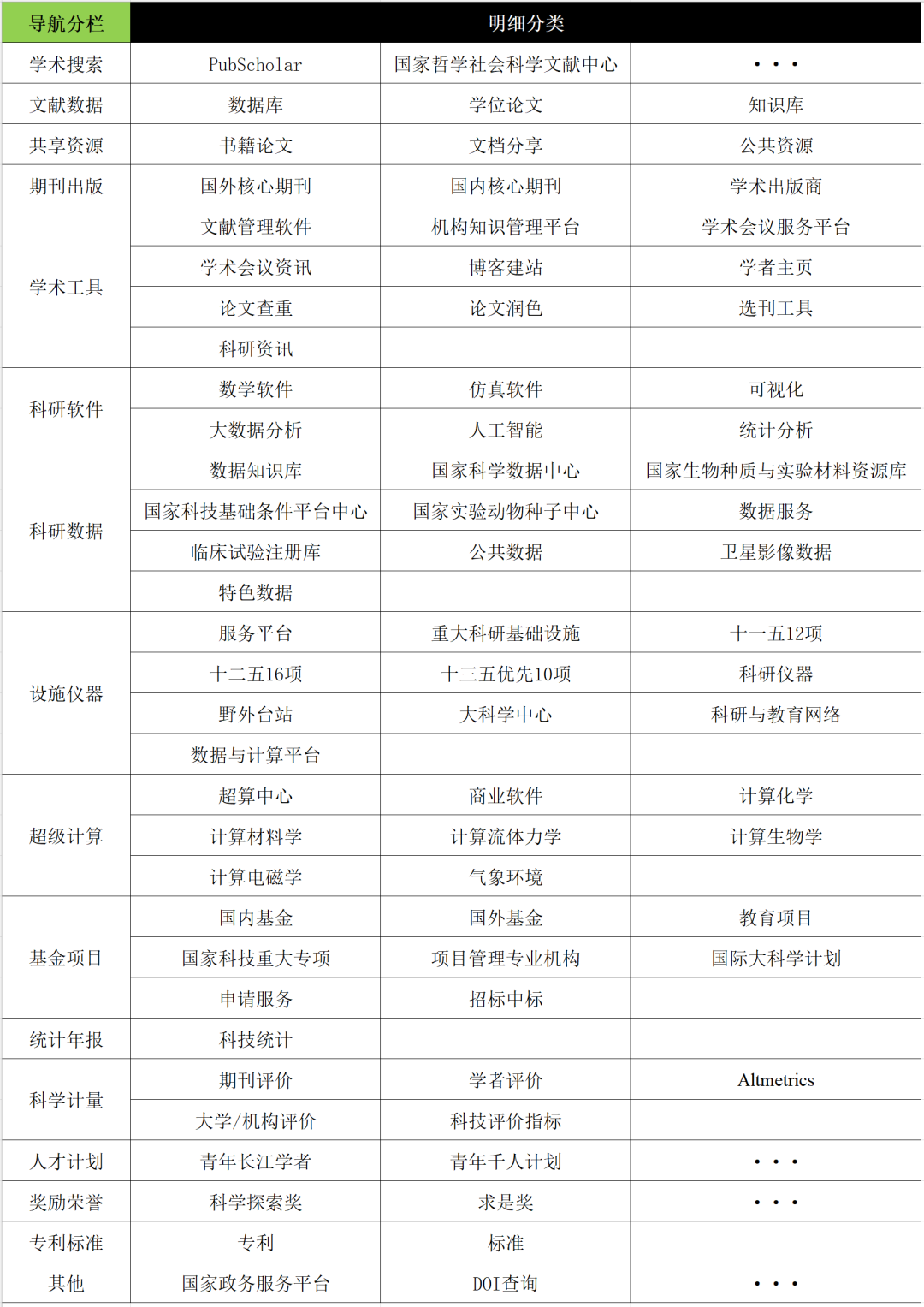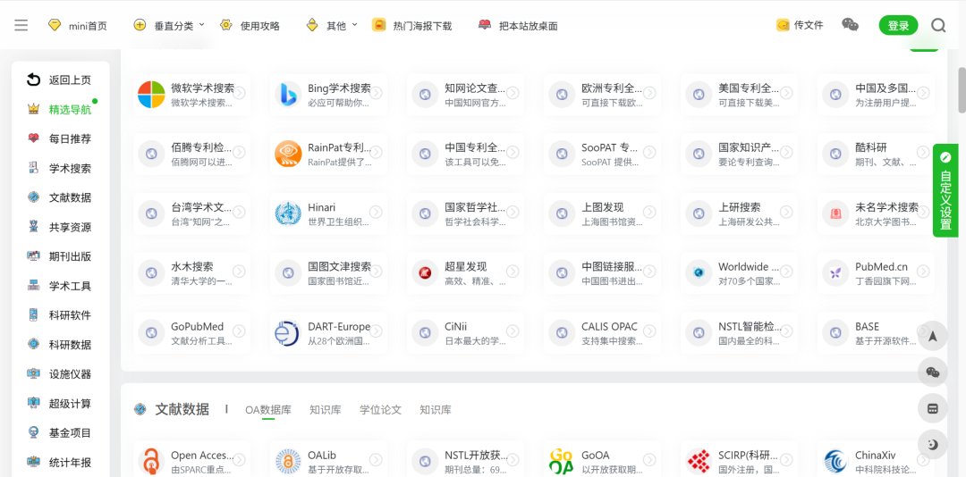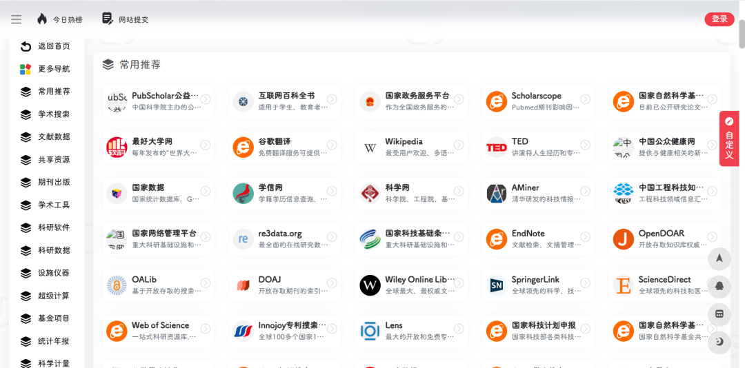 内容涵盖:学术搜索、文献数据、共享资源、期刊出版、学术工具、科研软件、科研数据、设施仪器、超级计算、基金项目、统计年报、科学计量、人才计划、奖励荣誉、专利标准。