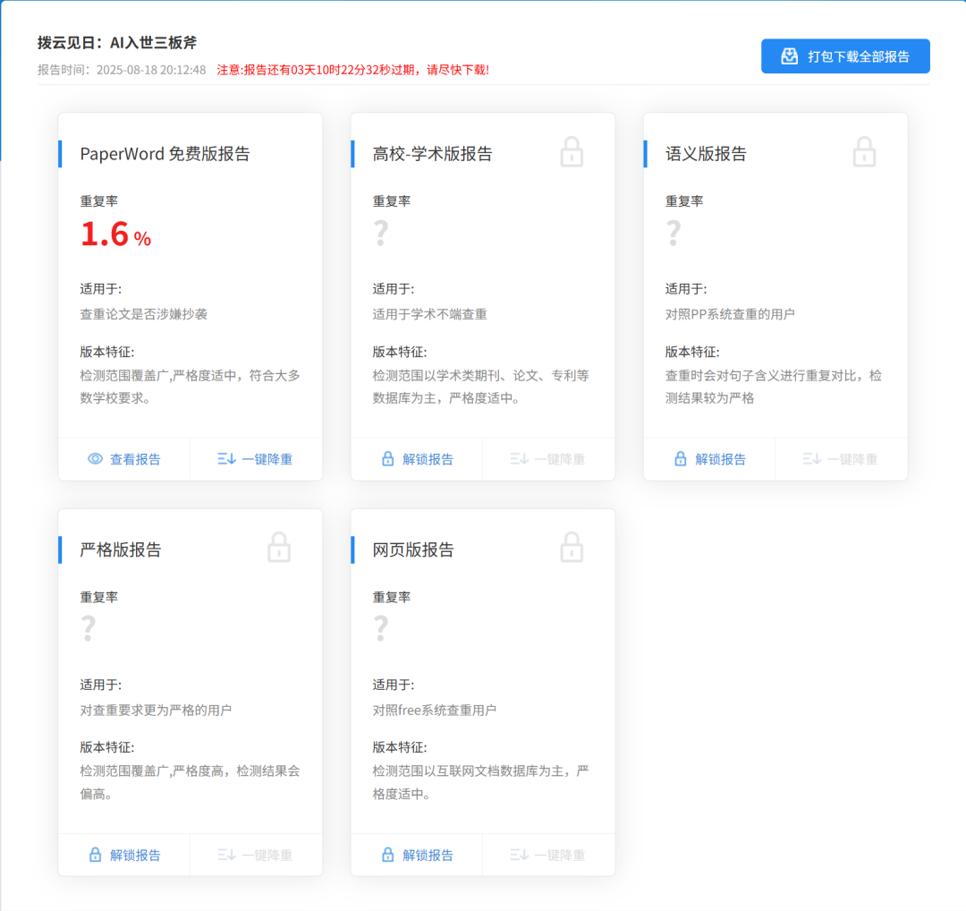 这类平台的野心更大,免费查重只是一个引流的入口,真正的“利润大头”是后续的增值服务。它们可能会故意用严苛算法让你的报告“满江红”,再向你高价推销“AI智能降重”或“人工降重”服务。查重是幌子,卖“降重”才是真心。