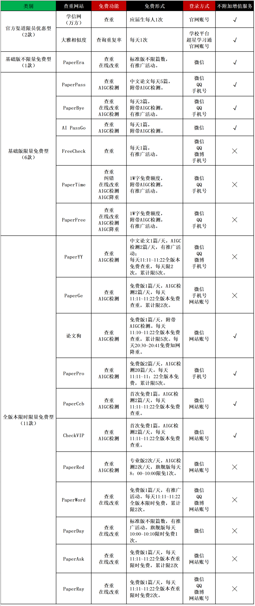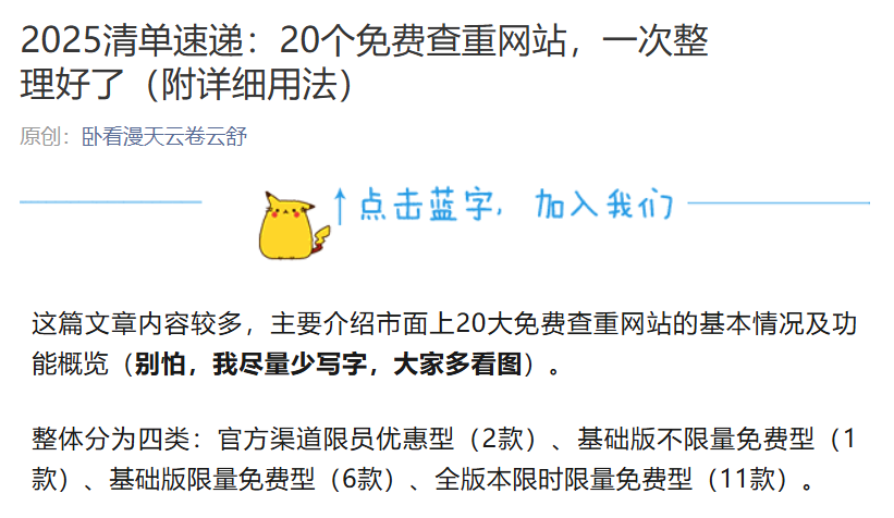 上述20大免费查重网站的功能概况和使用详情我也大致整理出来了,内容细致,篇幅较长,这里就不展开了,感兴趣的点击文末右下角的“ 下一篇 ”,跳转查看即可。